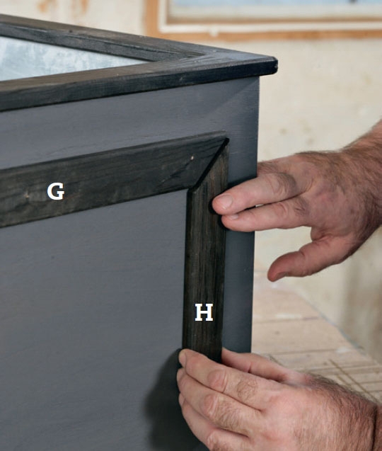 Pyntelisterne (G og H) klæber vi fast, så de danner ens felter på alle fire sider. Også de saves til med 45 graders hjørnesamling og males. Hold dem fast med små stifter, mens klæberen bliver tør.