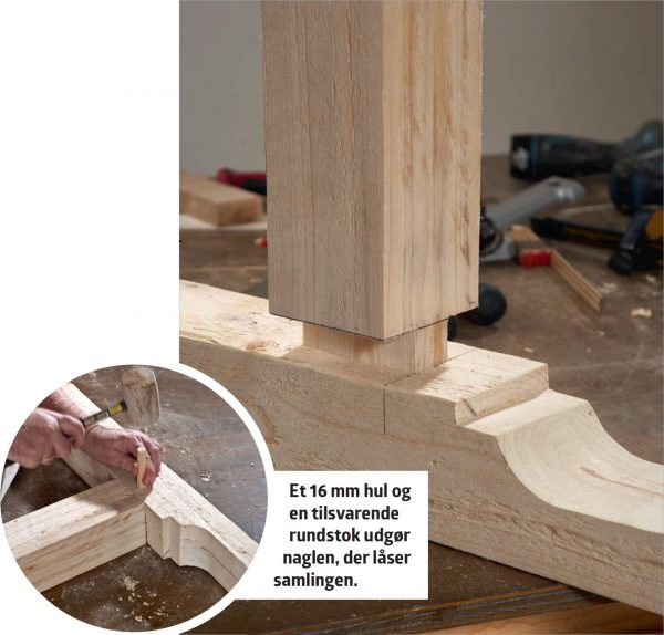 Tappen på stolperne stikker 2/3 ind i overliggeren (6,5 cm). Tappens bredde er min. 1/3 af stolpebredden.