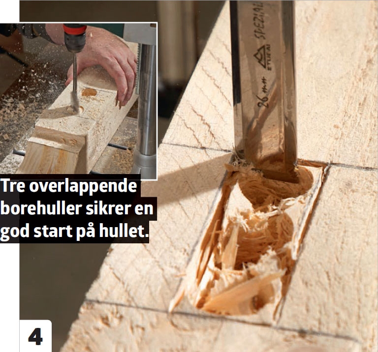 Bor ned i træet med hulsaven. Den skal kun netop møde din opstregning, ikke fjerne den. Hulsaven kan kun skære ca. 3 cm ned ad gangen.