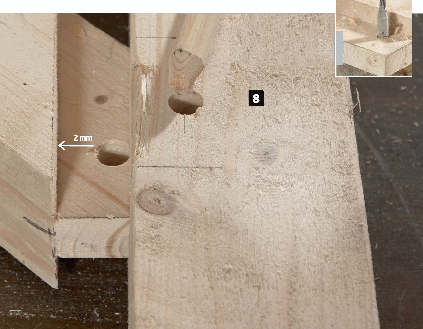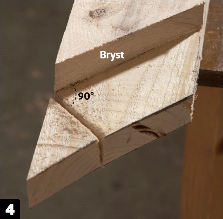 Sav tappen endeligt til. Streg vinkelret op på tappens bryst i flugt med skråstiverens yderside, og skær stykket af.