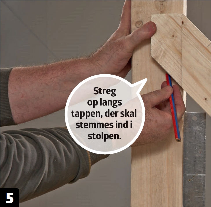 Streg op efter en skabelon. Skabelonen kan fx laves af masonit eller pap og forsynes med en liste som vist, så den kan lægges vinkelret på stolpen.