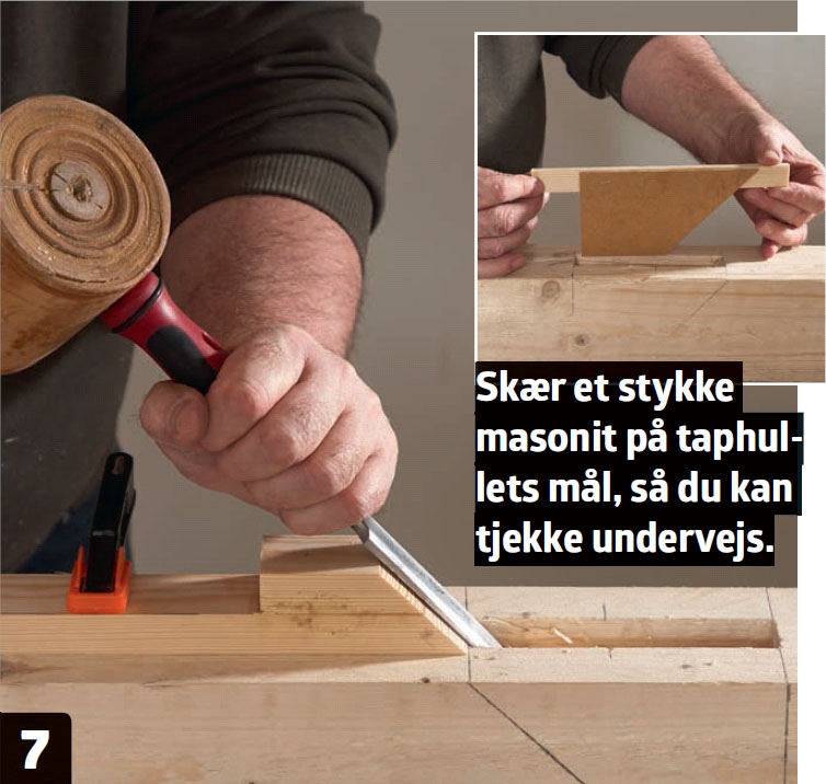 Sav 32 mm lodret ind fra begge stolpesider. Sav så ind fra endetræet. Sav på ydersiden af opstregningen (i affaldstræet), så tappen bliver fri.