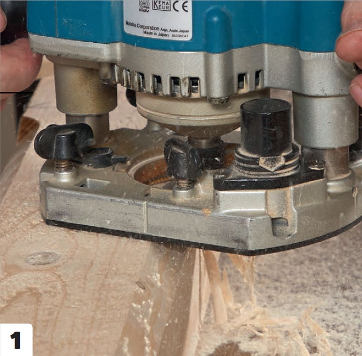 Sæt et 45° fasjern i overfræseren. Sænk jernet ned, så det rammer stolpekanten. Så er det blot at føre overfræseren langs kanten på det stykke, du vil affase.