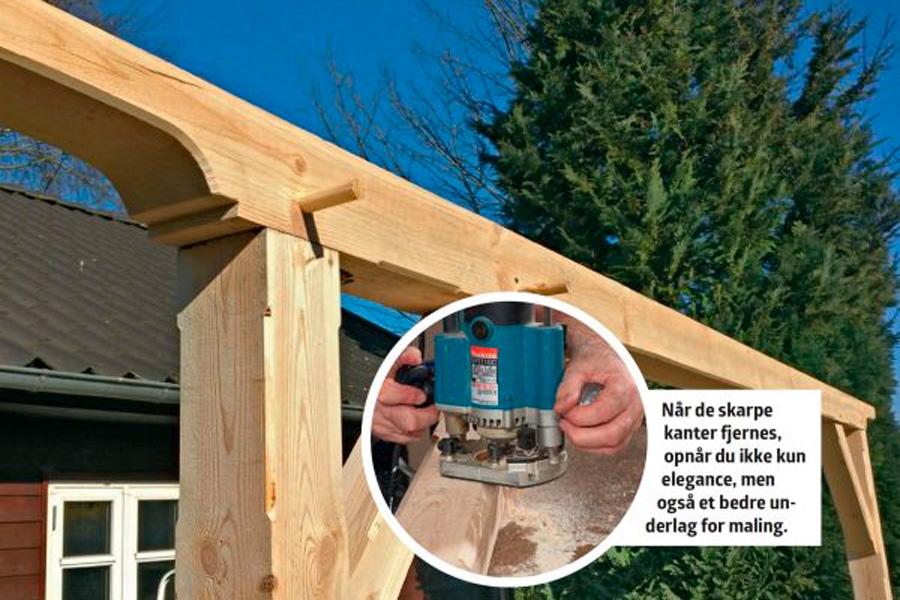 Rent konstruktionsmæssigt er der ingen grund til at lave snirklede udskæringer i overliggerne. De kunne sådan set bare ligge, som de var. Men det ser unægtelig mere elegant ud, hvis de kraf-tige stolper bliver slanket blot en smule. Om det så skal være med mere eller mindre “schwung”, er helt op til dig.