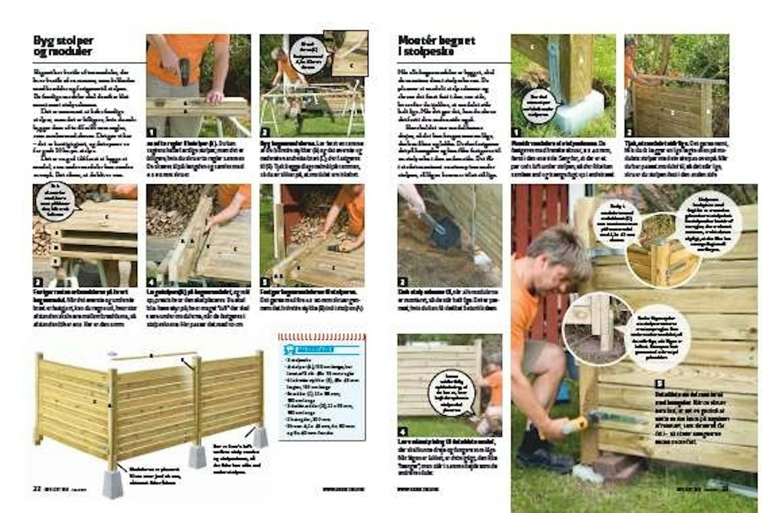 Hegnet her består af tre moduler, der hver består af en ramme, som beklædes med brædder og fastgøres til stolper. De færdige moduler skal derefter blot monteres i stolpeskoene.