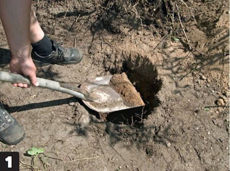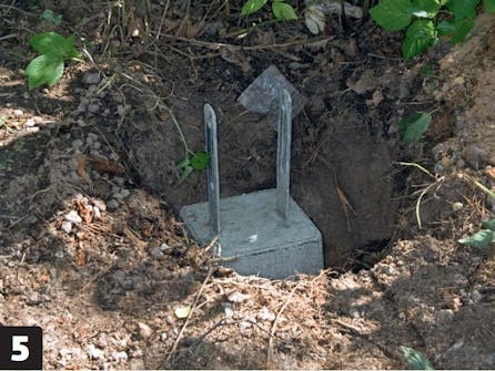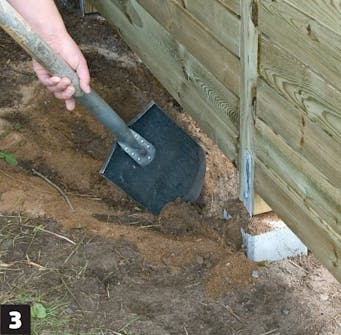 Grav ud til stolpeskoene, når du har målt op, præcis hvor de skal placeres. Fyld lidt grus ned i bunden af hullet, så det er lettere at justere dem på plads.
