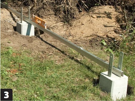 Hegnet her skal monteres i stolpesko, der graves ned i jorden. Grunden er lidt skrånende, så for at modulerne til hegnet kommer til at sidde lige, skal stolpeskoene placeres i forskellige dybder i jorden.
