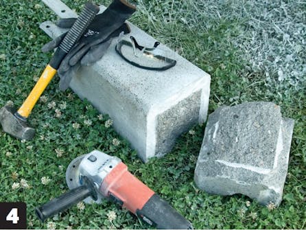 Skær evt. stolpeskoen til, hvis du støder på en stor sten i grunden. Vi blev nødt til at finde vinkelsliberen frem her for at få den ene stolpesko ned i niveau med de andre.