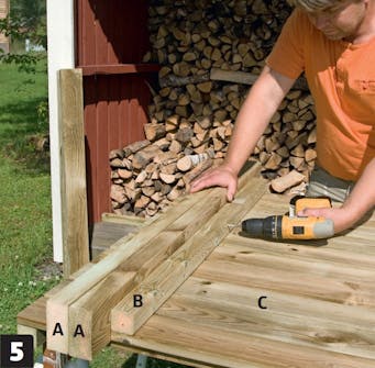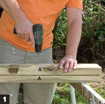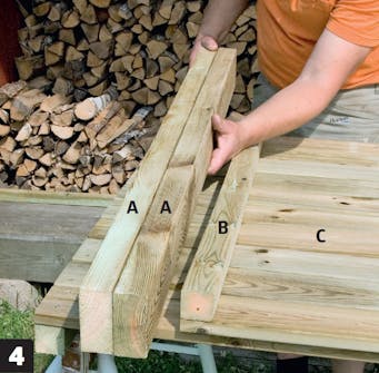 Saml to reglar til stolper (A). Du kan sagtens købe færdige stolper, men det er billigere, hvis du skruer to reglar sammen. De skæres til på længden og samles med 6 x 90 mm skruer.
