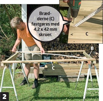 Byg hegnsmodulerne. Lav først en ramme af de lodrette stykker (B) og det øverste og nederste vandrette bræt (C), der fastgøres til (B). Tjek begge diagonalmål på rammen, så du er sikker på, at modulet er vinkelret.