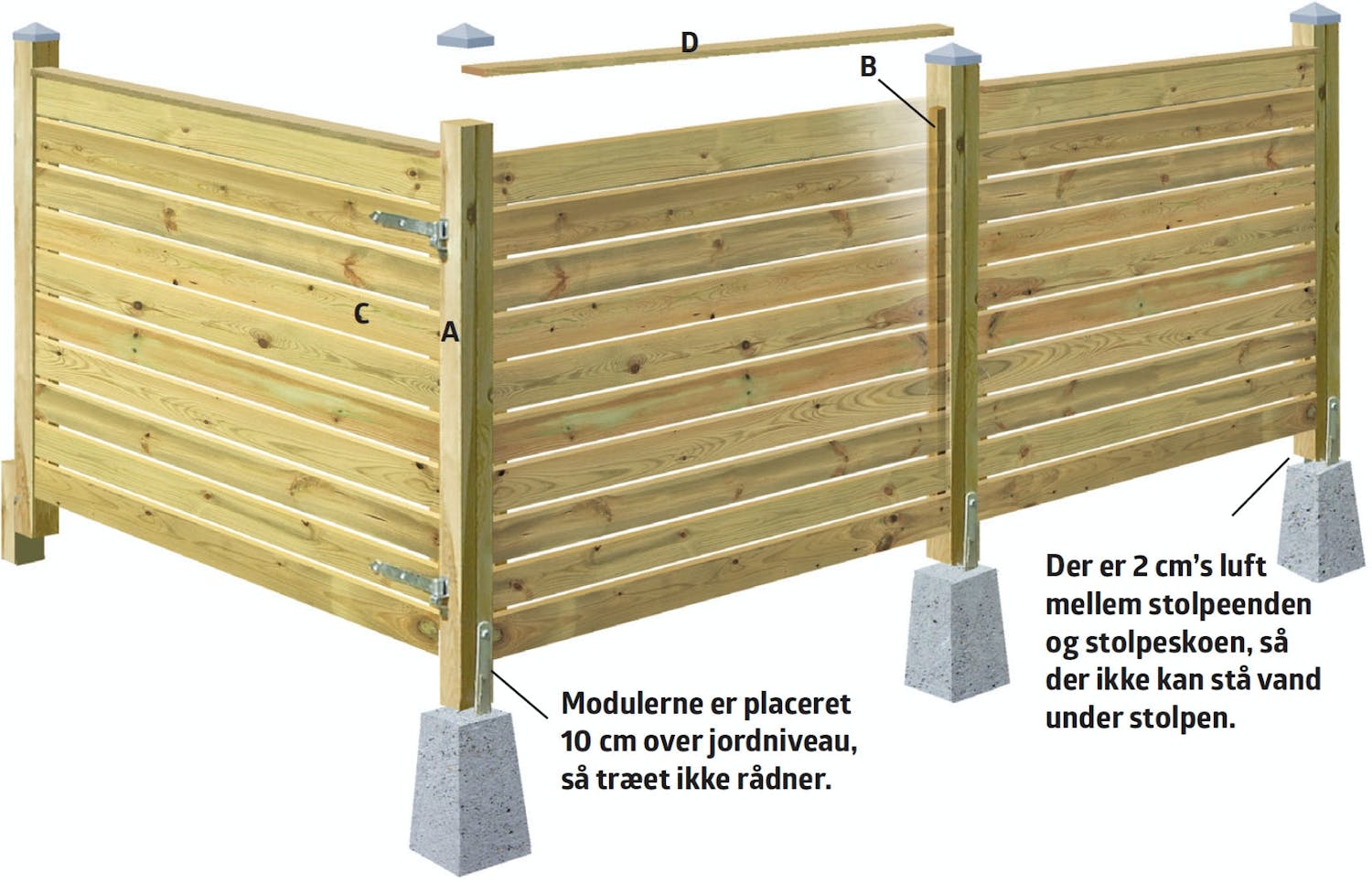 Læg stolpen (A) på hegnsmodulet, og mål op, præcis hvor den skal placeres. Du skal bl.a. have styr på, hvor meget “luft” der skal være under modulerne, når de fastgøres i stolpeskoene. Her passer det med 10 cm.