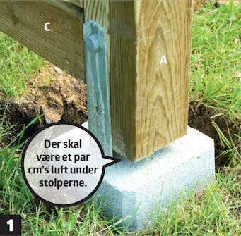 Montér modulerne i stolpeskoene. De fastgøres med franske skruer, 8 x 40 mm, først i den ene side. Sørg for, at der er et par cm’s luft under stolpen, så der ikke kan samles vand og trænge fugt op i endetræet.