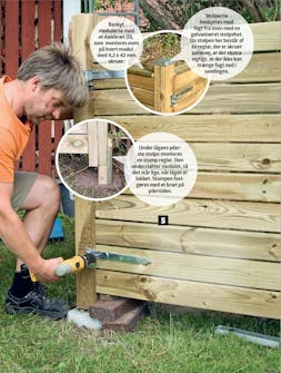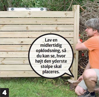 Tjek, at modulet står lige. Det gøres nemt, hvis du fx lægger en lige lægte oven på modulets stolper med et vaterpas ovenpå. Når du har passet modulet til, så det står lige, skruer du stolpen fast i den anden side.