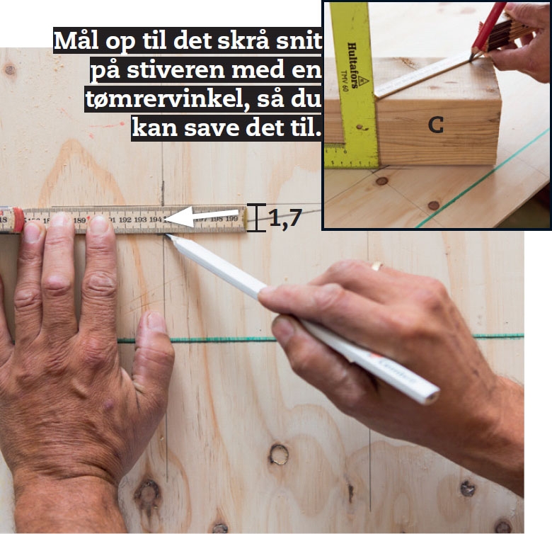 Afmærk det skrå hak til stiveren (C). Placer stiveren på pladen, og tegn op, hvor over- og undersiden går ind i stolpen (A) og overliggeren (B). Hakket er skråt og 1,7 cm bredt ved bageste kant (svarende til et tommestokled).