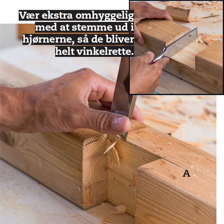 Mål op til hakket til det korte vandrette stykke (D). Brug en tømrervinkel og en spids blyant til at tegne hakket op med. Herefter saver du to snit i stolpen - i hver ende af hakket. Her laves hakkene 3,5 cm dybe.