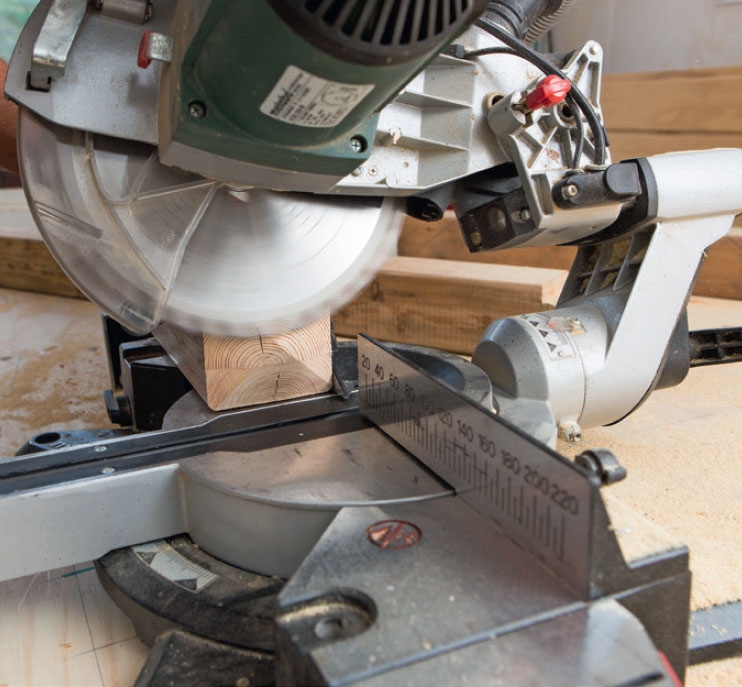 Lav et savsnit med en fukssvans i stolpen (A) der, hvor det skrå hak til skråstiveren (C) skal være. Med et skarpt snit i stolpen er det lettere at stemme ud, så det bliver pænt.