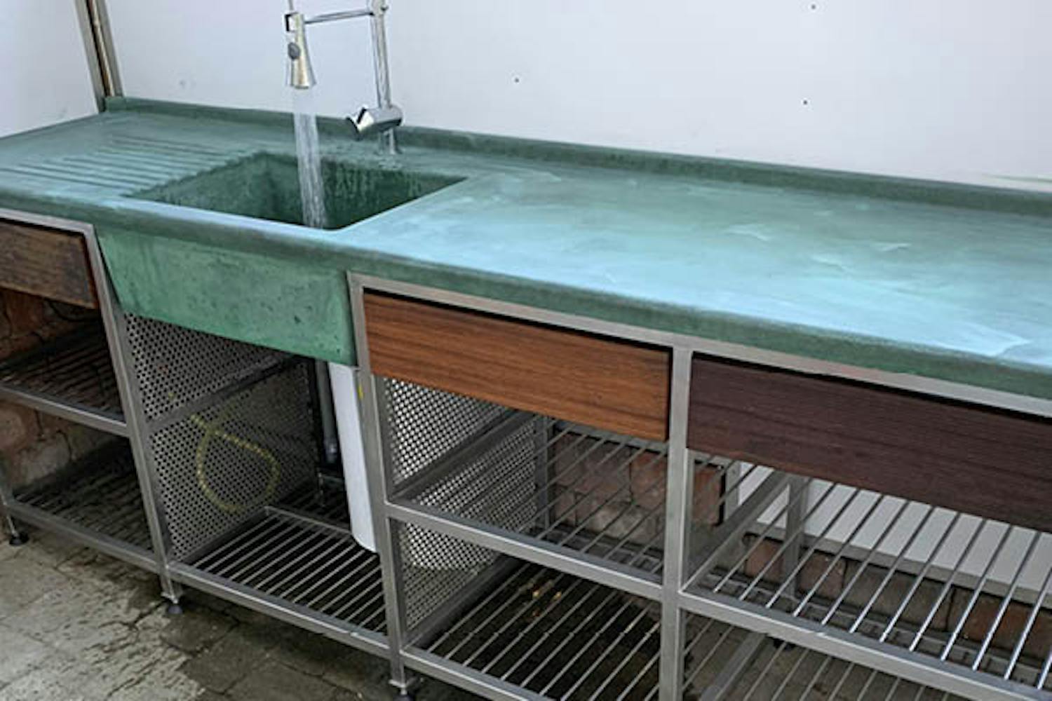 Stålbordplader findes i massive versioner og noget oftere i form af træplader pakket ind i stålplade. Begge typer er meget varmeresistente og kan laves med indbygget håndvask.