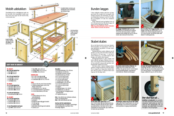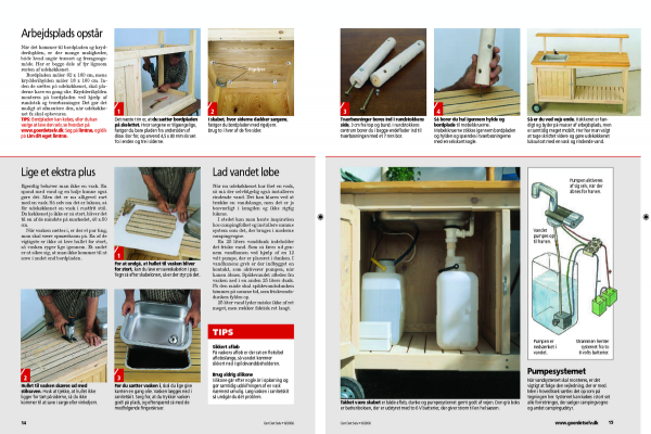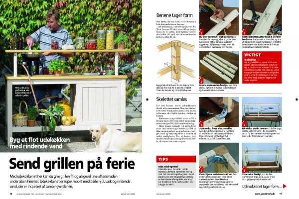 Bordpladen måler 62 x 160 cm, mens krydderihylden måler 18 x 160 cm. In-den de sættes på udekøkkenet, skal pla-derne have en gang olie. Krydderihylden monteres på bordpladen ved hjælp af rundstok og tværbøsninger. Det gør det muligt at afmontere den, når udekøkke-net fx skal opbevares.