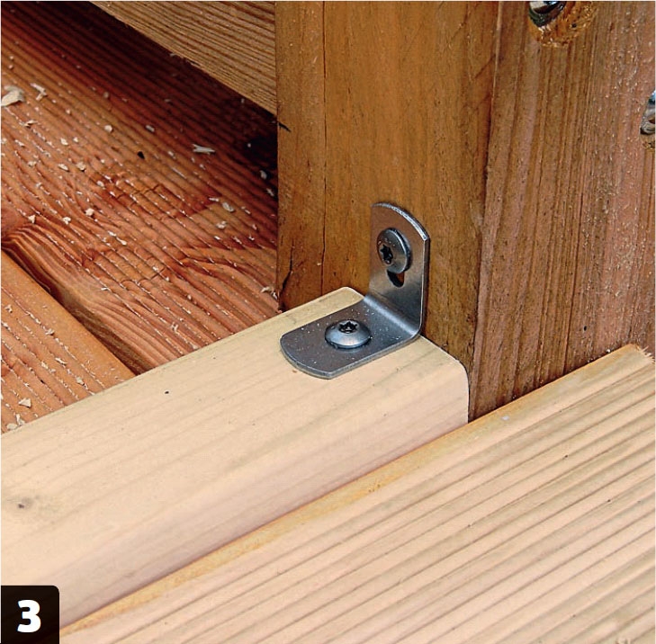 Bor for. For at undgå at terrassebrædderne flækker, skal du bore for, inden du skruer skruerne i. Du kan med fordel bore for med en forsænker monteret, så skruer og terrassebrædder er i niveau.