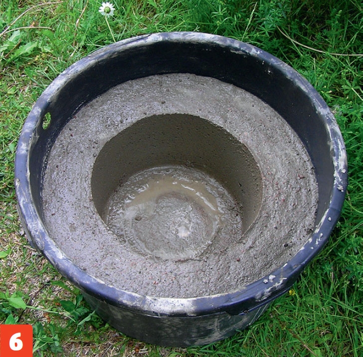 Stil den mindre balje oven i betonblandingen i den store balje. Læg noget tungt i den mindre balje, fx et par marksten, så den ikke flytter sig, når du hælder mere beton i.