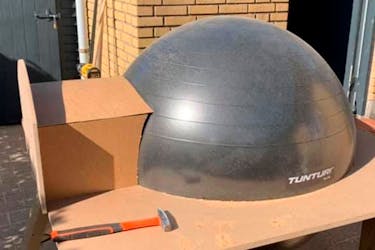 Skabelonen til kuplen er i dette tilfælde en pilatesbold med en diameter på 90 cm. Skær et hul med en diameter på ca. 89 cm i en plade, så halvdelen af bolden er synlig, samtidig med at bolden sidder i spænd.