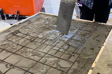 Byg en støbeform af krydsfiner og brædder. Betonpladens tykkelse bør være min. 4 cm. Bland første halvdel ret vådt, og læg derefter rionettet. Anden halvdel blandes mere tørt, så det bedre kan formes.
