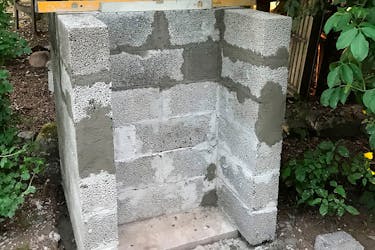 Stenene halveres, så de er kvadratiske. Herefter opmures siderne som det første. Sørg for, at stenene også hæfter grundigt på perlitdelen af forkammeret.