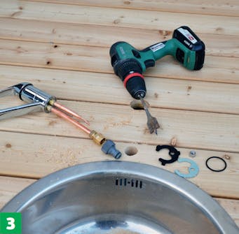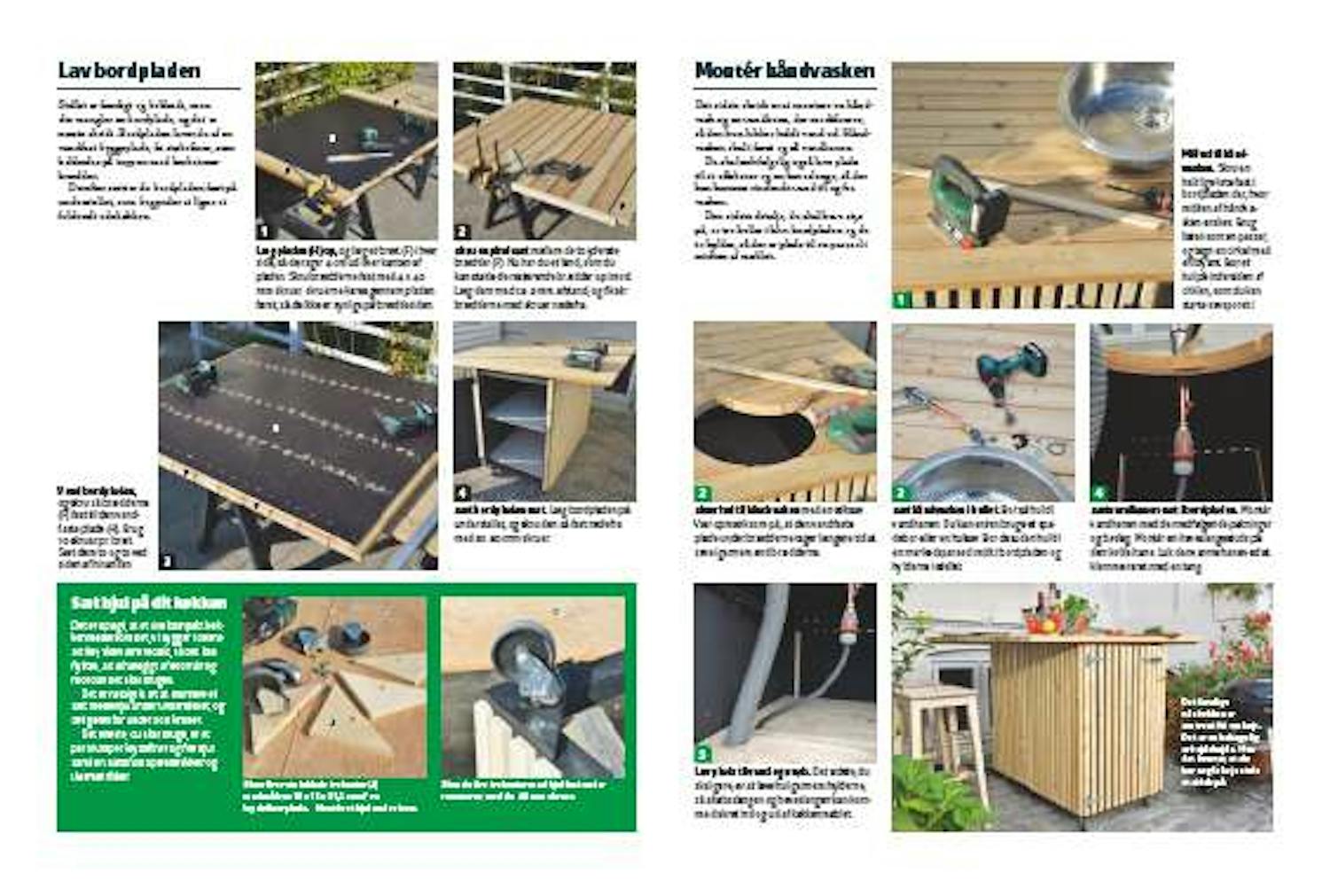 Sæt håndvasken i hullet. Bor så hul til vandhanen. Du kan enten bruge et spadebor eller en hulsav. Bor desuden hul til en markedsparasol midt i bordpladen og hylderne i stellet.