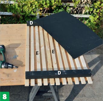 Søm de to yderste beklædningslister (E) på den ramme, du netop har skruet de fire lægter (C) fast til. Vend derefter rammen, så den hviler på beklædningslisterne (E).