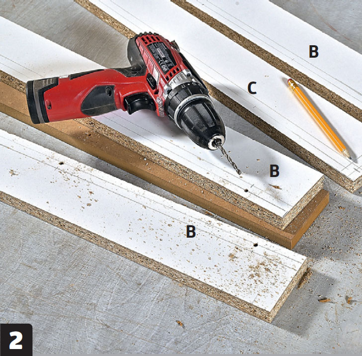 Bor for, før du samler. Start ved kanten, og bor hul hver 12. cm på en linje 9 mm fra bunden af alle sidestykkerne (B, C og D). Bor også to huller med 5 cm’s afstand 9 mm fra kanten af medium sidestykkerne (C).
