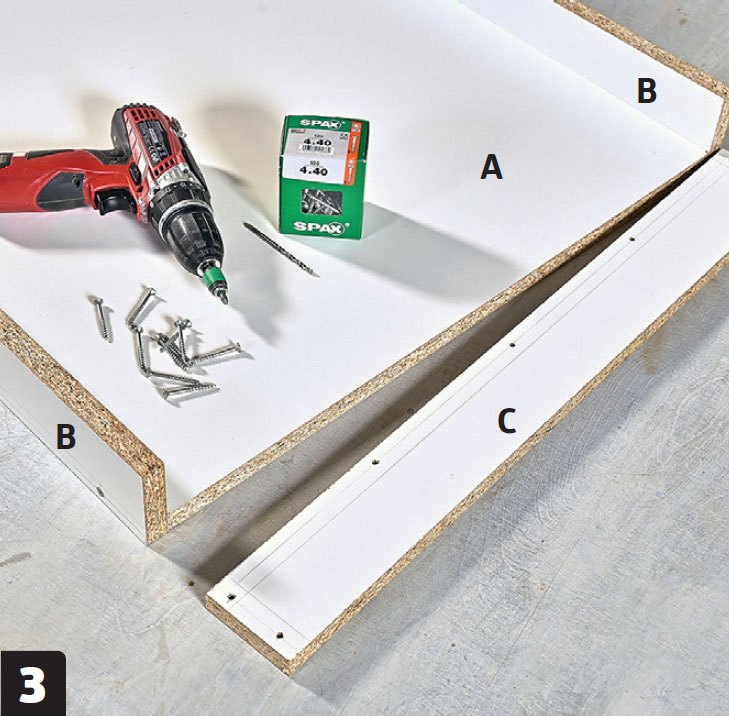 Saml formen fra ydersiden med 4 x 40 mm skruer. Sidestykkerne (B, C og D) skrues fast til bundpladerne (A og E) gennem de forborede huller. Start med de sidestykker, der har samme længde som deres bundplade.