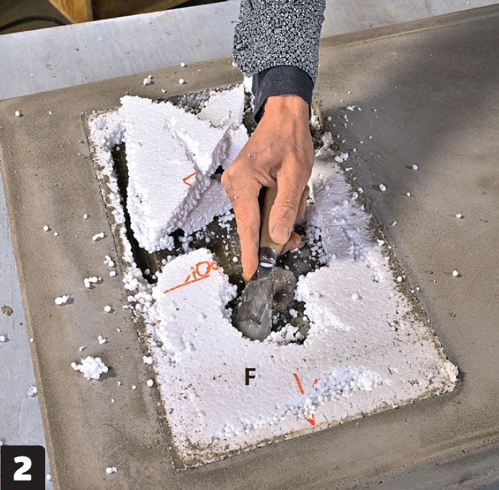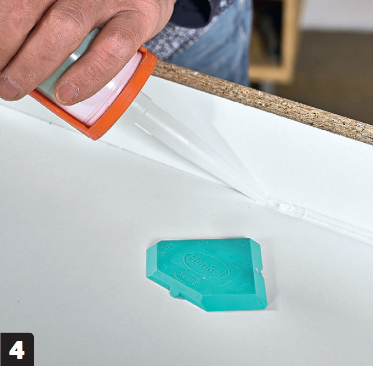 Bagefter lægges der en sirlig, trekantet silikonefuge i formens indadvendte samlinger. For at lave plads til vasken skal du lime et stykke flamingo med tilsvarende mål i formen. Endelig skal du lave en let kerne i to materialer, der støbes ind i pladen.