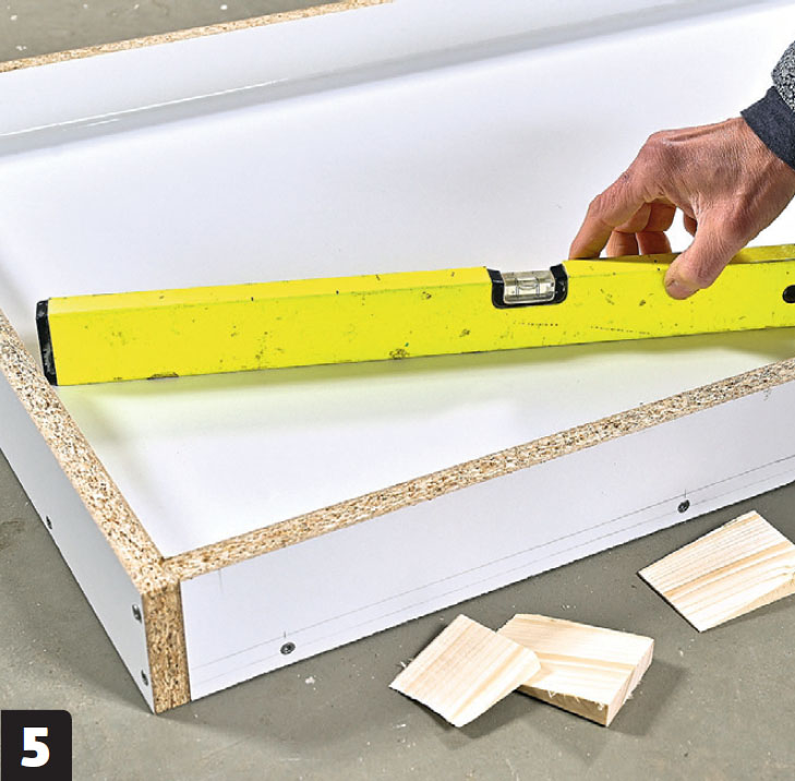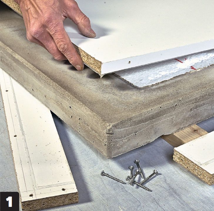 Du skal bygge to støbeforme. Processerne er ens, med undtagelse af at der kun skal laves plads til en håndvask i den ene bordplade. Formene består af fem dele, en bundplade og fire sidestykker, som du skærer ud af en melaminbelagt spånplade. Formene samles med skruer i forborede huller.