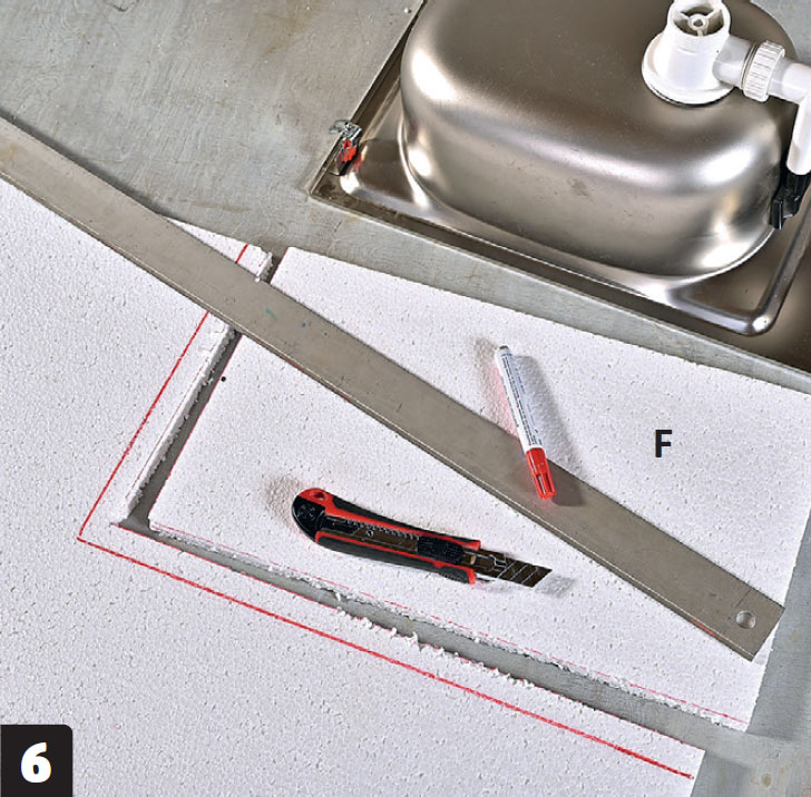 Skær et stykke flamingo (F) med samme dimensioner som den del af håndvasken, der skal sænkes ned i bordpladen (her 44 x 50 cm). Du skal kun skære ét stykke, da der ikke er en håndvask i begge bordplader.