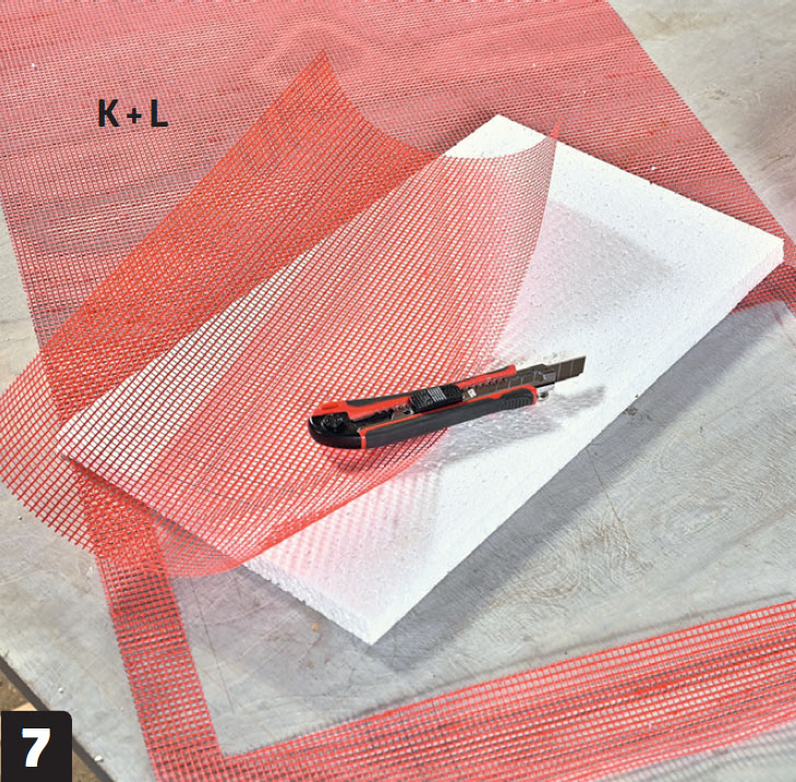 Skær et stykke armeringsvæv (K og L) til hver form. Armeringsnettene skal passe til formenes indre dimensioner minus 2 mm i hver side. Det store armeringsnet (K) skal skæres til, så der er hul til vasken.