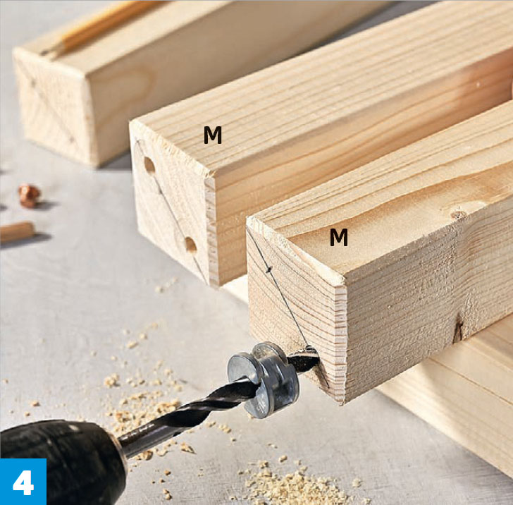 Gør klar til dyvler i modsatte ende. Vend benene (M) om. Tegn en diagonal streg fra hjørne til hjørne. Mål 1 cm ind fra hver side af stregen, og bor ved begge mærker et 2 cm dybt hul med et 8 mm bor.
