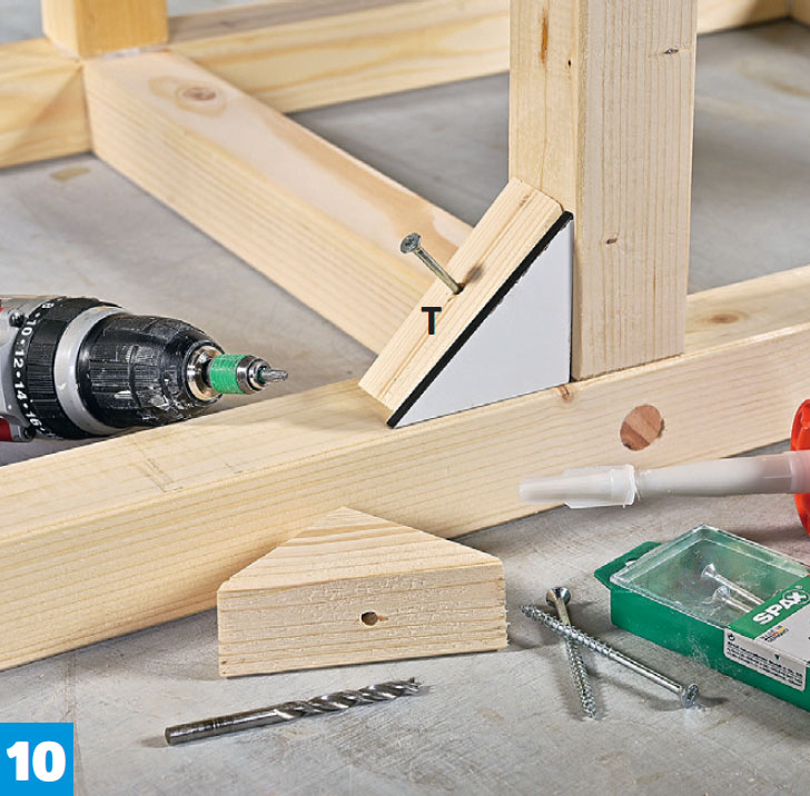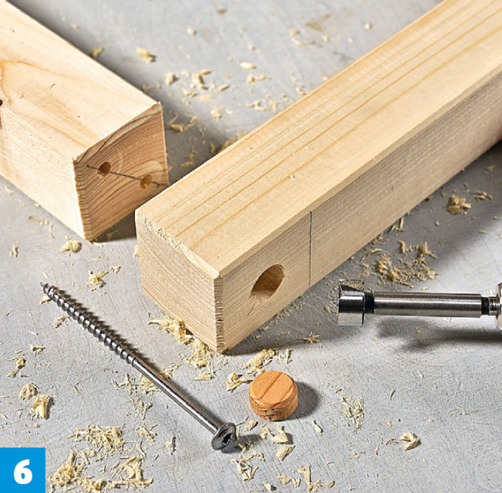 Skjul skruehovederne med propper. De 4 x 80 mm skruer, du har brugt til at samle stellet med, skal skjules. Det klarer du ved at banke en Ø 20 mm træprop i hullerne. Proppen slibes derefter plan med stellet.