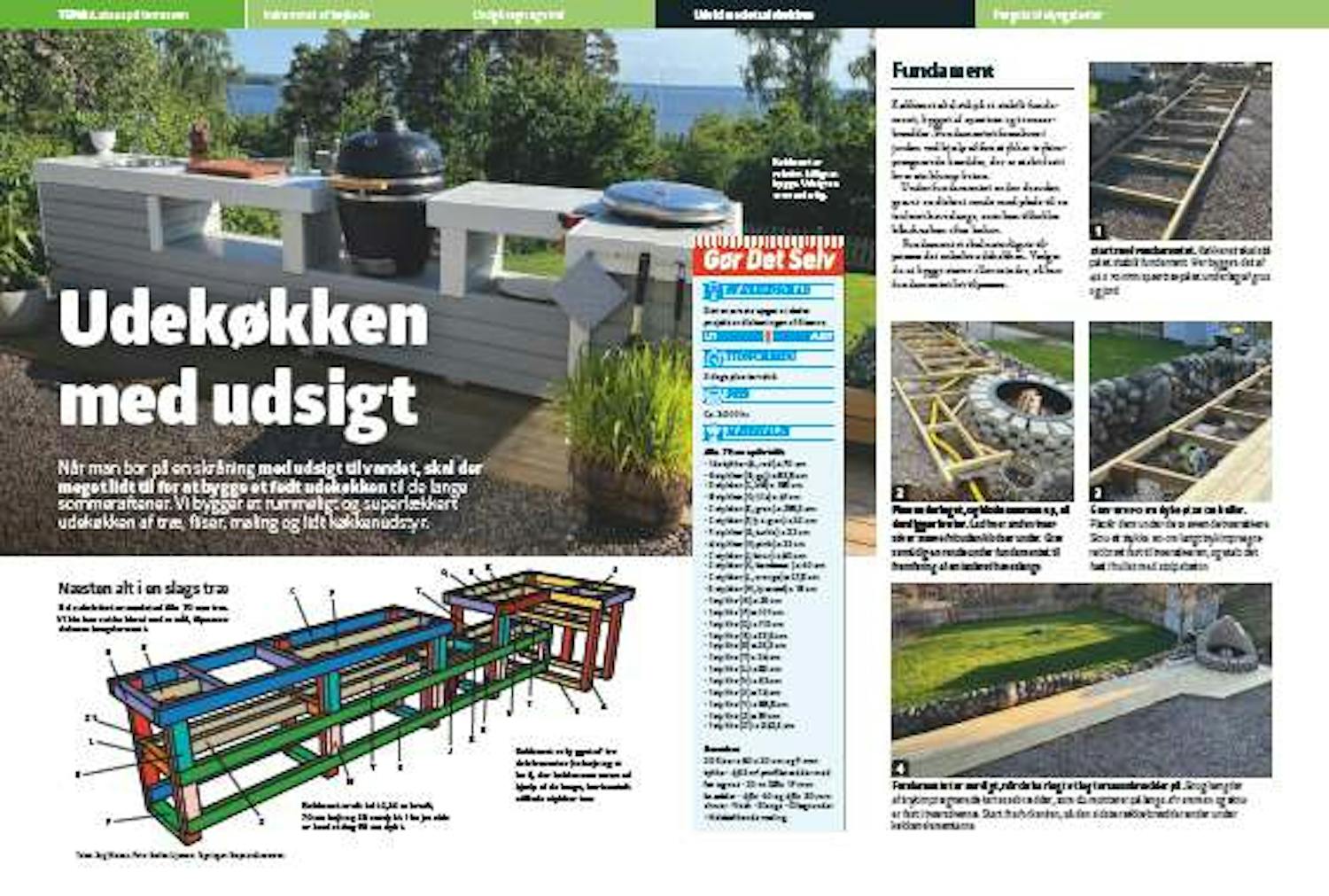 Udekøkkenet afsluttes med overflader af profilbrædder og fliser. Skelettet beklædes her med vandrette brædder, der males grå og indrammes med kanter af hvidmalede brædder.