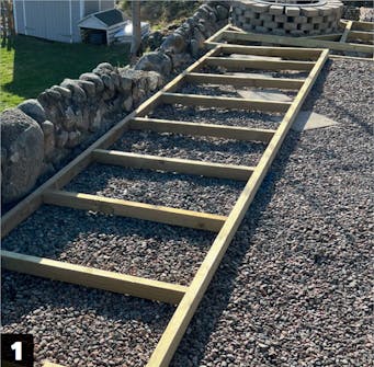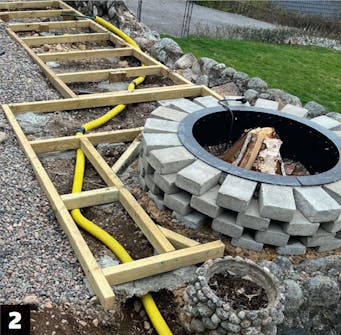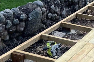 Start med fundamentet. Køkkenet skal stå på et stabilt fundament. Her bygges det af 45 x 70 mm spærtræ på et underlag af grus og jord.
