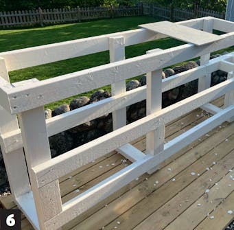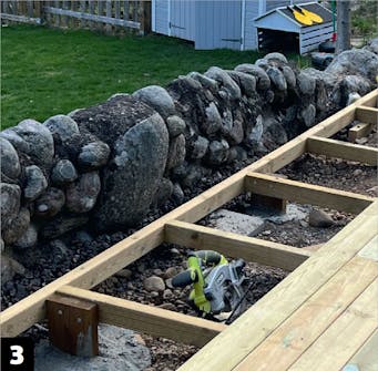 Grav fire 90 cm dybe Ø 25 cm huller. Placér dem under de svævende tværstivere. Skru et stykke 90 cm langt trykimprægneret bræt fast til tværstiveren, og støb det fast i hullet med stolpebeton.
