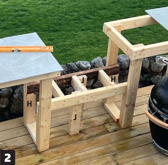 Køkkenet består af to høje køkkenborde og en lavere platform. Du skal bygge køkkenbordene først. Platformen skal samles til sidst og skrues fast mellem de høje elementer.