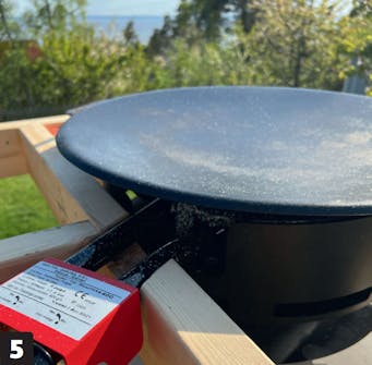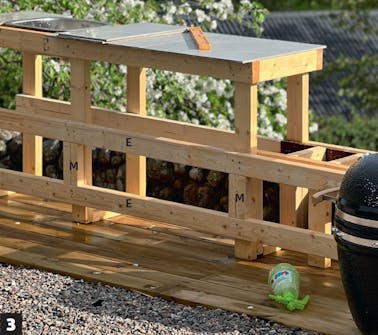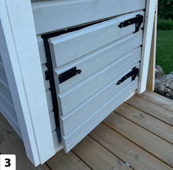 Her er der sat en låge i vinkelelementet. Der er plads til en flaske gas under gasblusset. Lågen skæres ud af beklædningsbrædderne og udstyres med hængsler og en skudrigel, så du kan få gasflasken ind og ud.