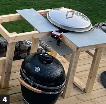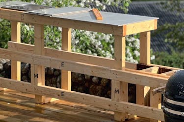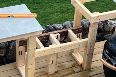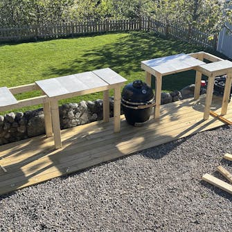 Køkkenet skal stå på et stabilt fundament, bygget af spærtræ og terrassebrædder. Fundamentet forankres i jorden ved hjælp af fire stykker trykimprægnerede brædder, der er støbt fast i hver sin klump beton.