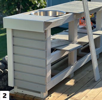 Beklæd køkkenet med brædder. Montér dem vandret på langs af elementerne. Her er der anvendt brædder med fer og not, der giver hele køkkenet en lettere tekstur. Brædderne er farvet, så de matcher huset.