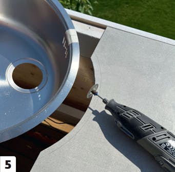 Skær ud til håndvasken. Her bruger vi en rund håndvask. Den får du plads til ved at skære de fire nærmeste fliser til, fx med et Dremel-multiværktøj og en lille klinge til sten.