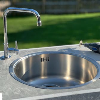 Under fundamentet er der desuden gravet en diskret rende med plads til en isoleret haveslange, som kan tilkobles håndvasken efter behov.