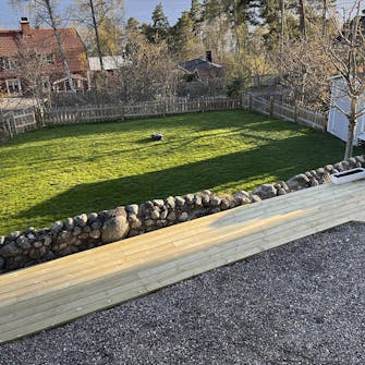 20 fliser a 60 x 30 cm og 9 mm tykke • 4,63 m² profilbrædder med fer og not • 20 m 125 x 19 mm brædder • 4,5 x 60 og 4,5 x 80 mm skruer • Vask • Slange • Oliegrunder • Heldækkende maling