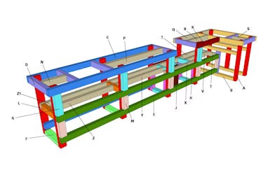 Køkkenet er bygget op omkring et skelet lavet i spærtræ. Skelettet konstrueres først i tre forskellige sektioner, der efterfølgende spændes sammen og forstærkes på tværs.