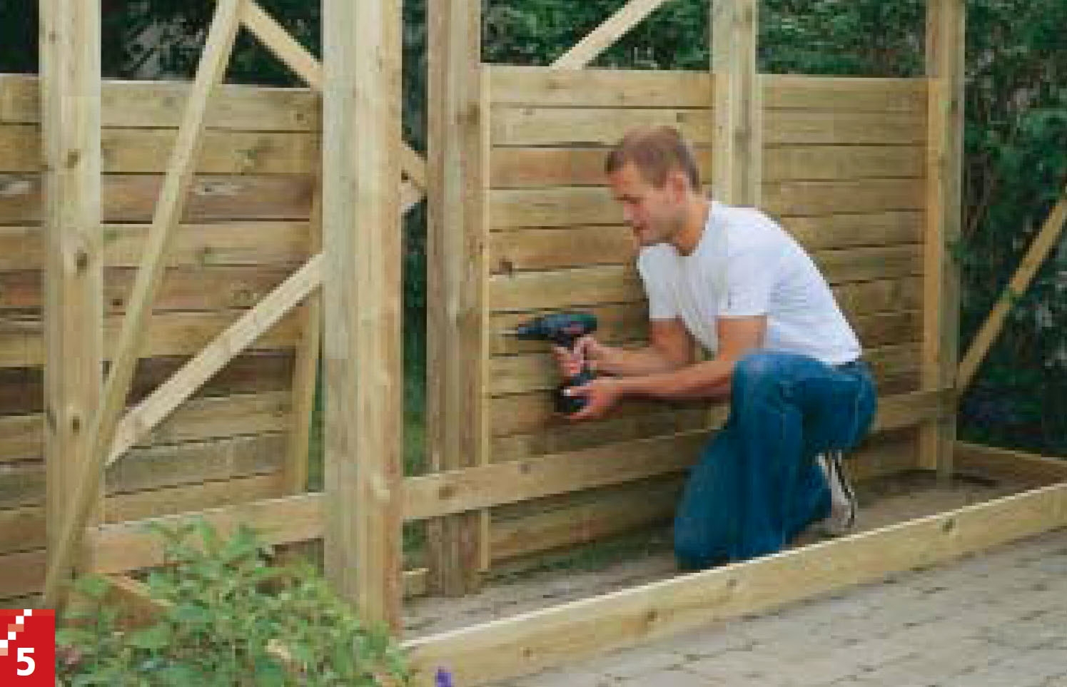 Fastgør beklædningerne mellem stolperne ca. 5 cm over jorden med 5,0 x 60 mm skruer. Listerne (Q) placeres i plan med stolpernes indersider.