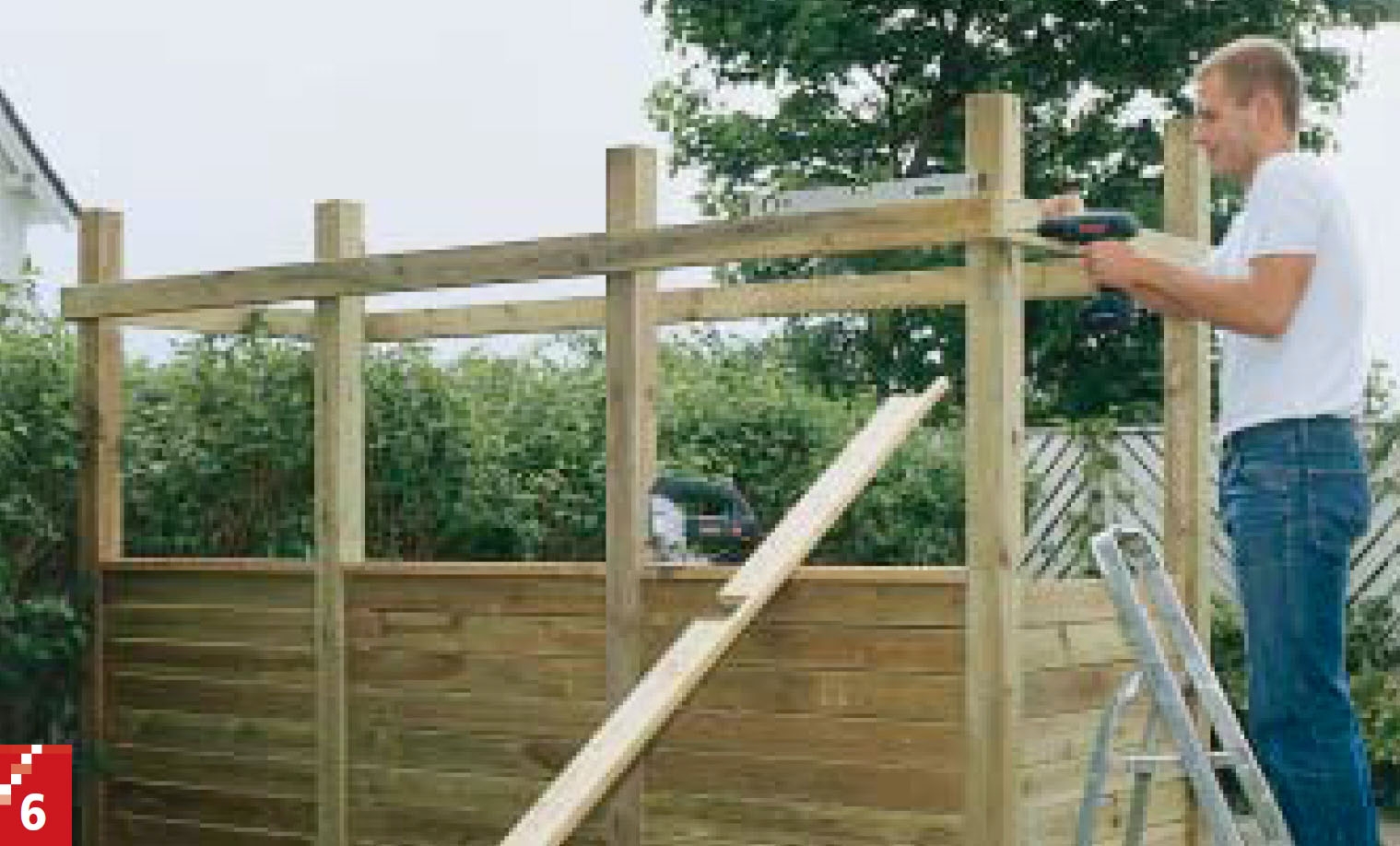 Skru topbjælkerne (B) på stolperne 192 cm fra underkanten af beklædningerne med 5,0 x 80 mm skruer. Fastgør brædderne (F) i enderne. Fjern afstivninger. Sav ud til stolperne i de to brædder (A1) og (B1), så de flugter stolpernes yderside. Skru nederste bræt (A1) på beklædningen. Øverste bræt (B1) fastgøres i flugt med bjælken (B’s) underkant med 5,0 x 80 mm skruer.